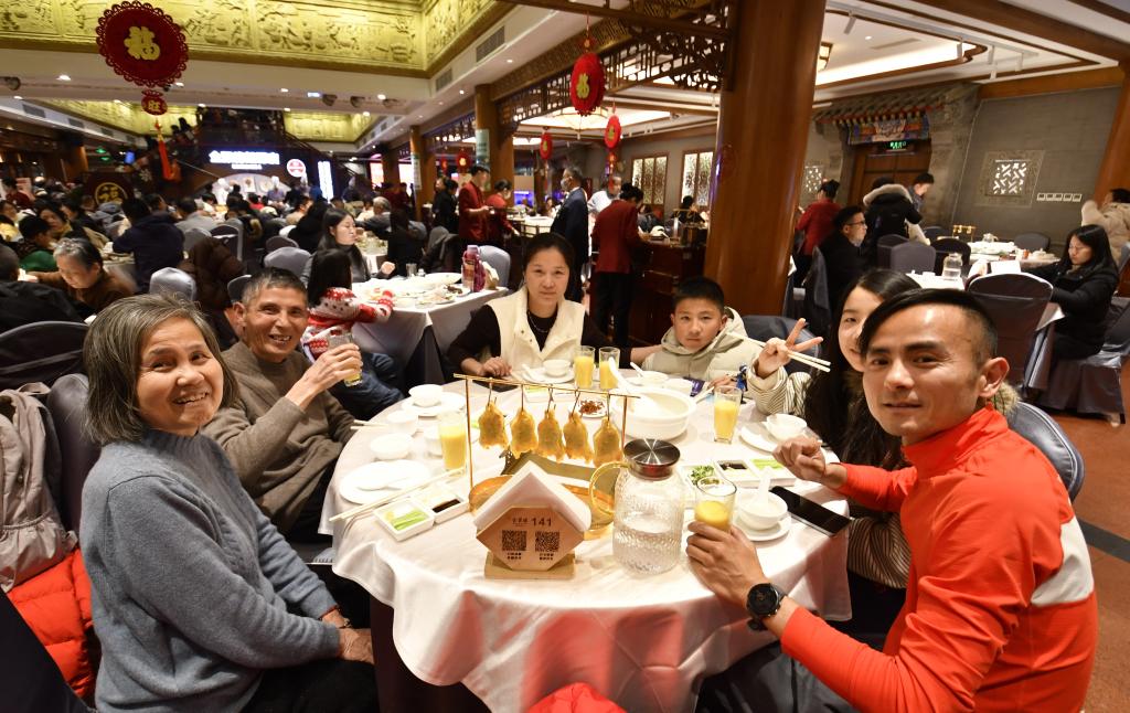 2月16日,来自浙江宁波的游客在北京前门步行街的全聚德吃年夜饭。新华社记者 李欣 摄