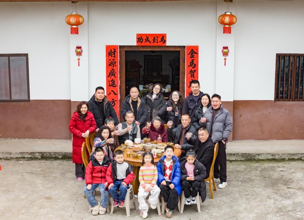 2月16日,在四川省南充市顺庆区清平村,村民陈俊尧一家祖孙四代吃团年饭。新华社发(彭珉翔 摄)