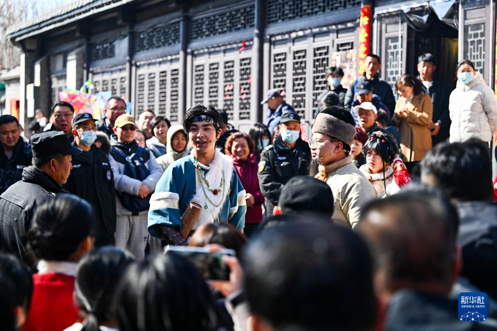 2月22日,游客在杨柳青古镇观看演出。
