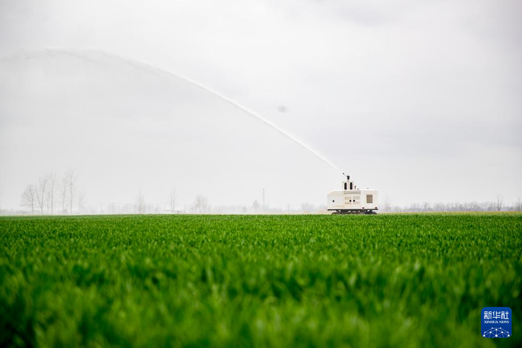 2月24日,在河南省商丘市睢县后台乡一处农田内,无人智能灌溉机器人进行水肥一体化喷灌作业。新华社发(徐泽源摄)