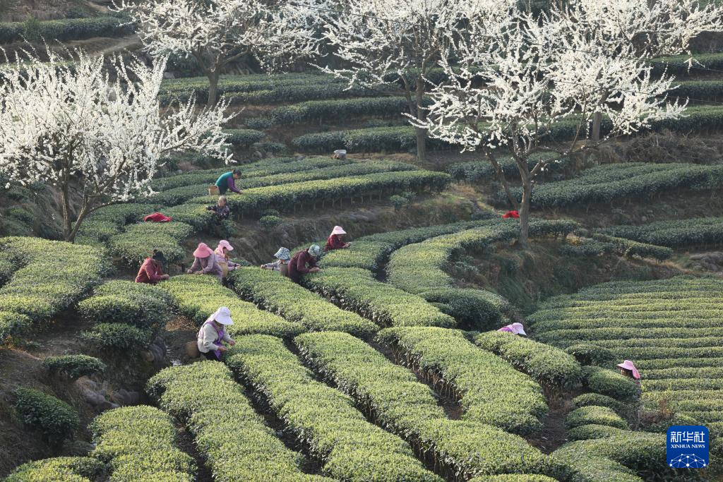 2月26日,茶农在四川省眉山市洪雅县止戈镇青杠坪村万亩生态茶园采摘春茶。新华社发(姚永亮摄)