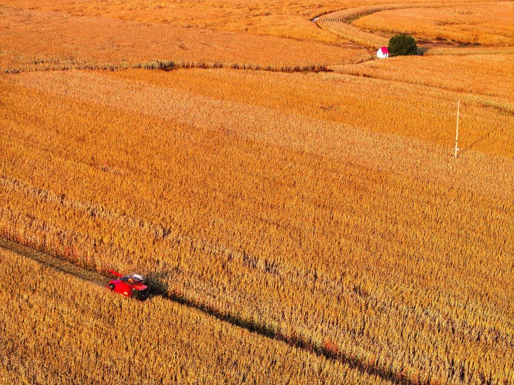 农机手驾驶收割机在内蒙古自治区通辽市科尔沁区丰田镇收割玉米(2025年10月14日摄,无人机照片)。“十四五”时期,粮食总产量由2021年的1.37万亿斤增至2025年的1.43万亿斤,连续两年站稳在1.4万亿斤的台阶。