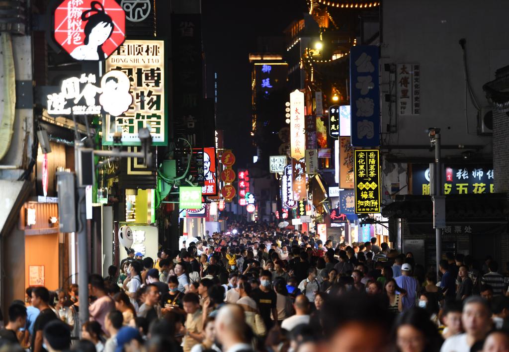游客在长沙市太平古街休闲游览(2022年7月29日摄)。“十四五”期间,非物质文化遗产、文博IP等消费爆款频现,城市漫步、中式茶饮等成为时尚消费潮流,各地推行各类优惠、补贴,释放消费潜能,激发市场活力。
