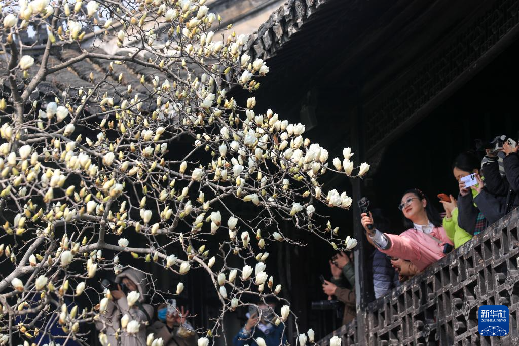 3月8日,游客在江苏扬州何园景区欣赏玉兰花。新华社发(齐立广摄)