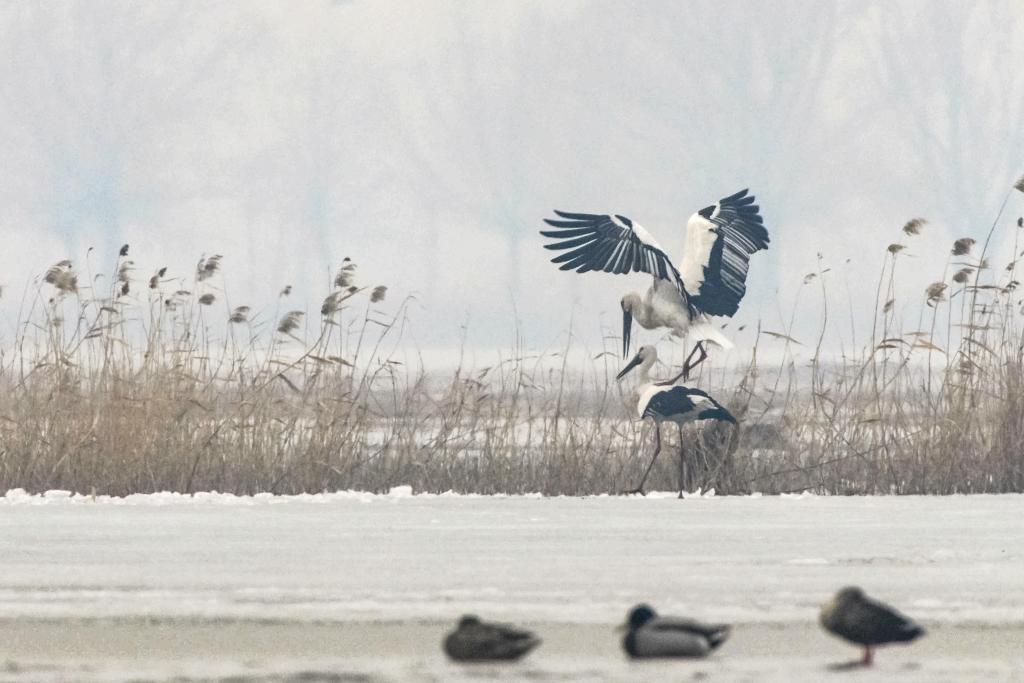 3月18日,东方白鹳和苍鹭等鸟类在松花江哈尔滨段一处水域休憩觅食。新华社发(杨威摄)