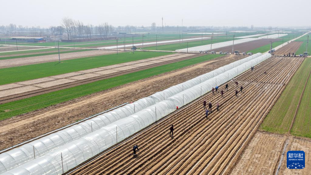3月25日,河北省石家庄市行唐县南桥镇农民在田间搭设姜棚(无人机照片)。新华社发(梁子栋摄)