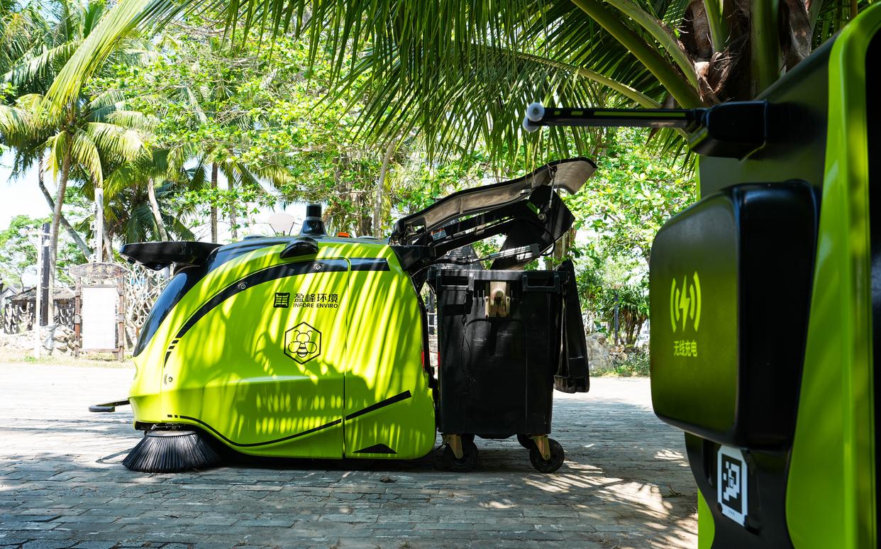 小蜜蜂智慧清洁机器人在位于海南省琼海市潭门镇排港村作业(3月25日摄)。新华社记者 杨冠宇 摄