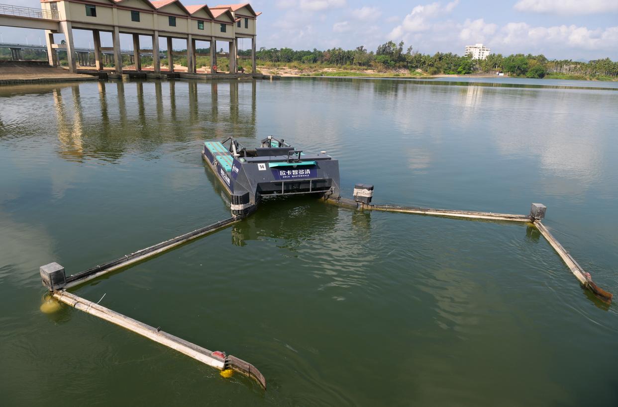 水上智慧环卫无人清洁船在万泉河水面作业(3月25日摄)。新华社记者 刘莲芬 摄