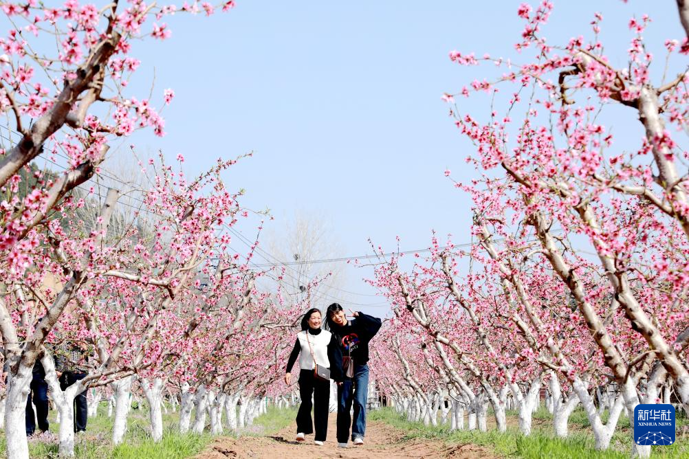 3月25日,游客在河南省济源市坡头镇清涧村百亩桃园打卡拍照。新华社发(段二平摄)