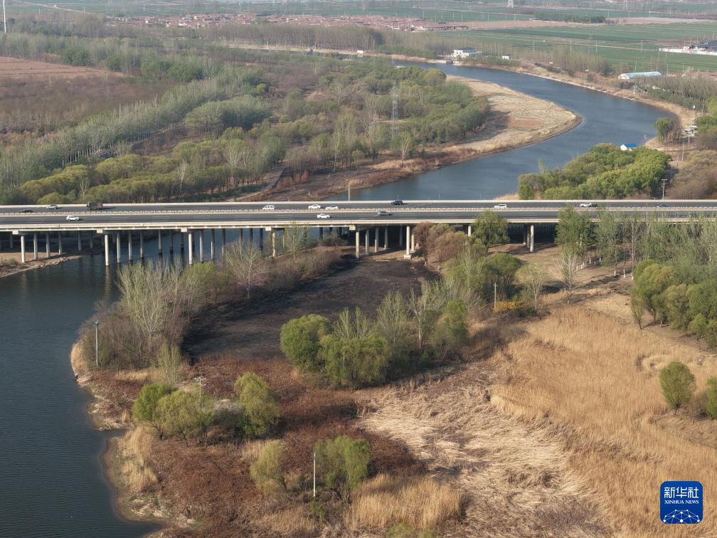4月4日拍摄的京杭大运河天津武清段的春天景色(无人机照片)。新华社记者 邢广利 摄