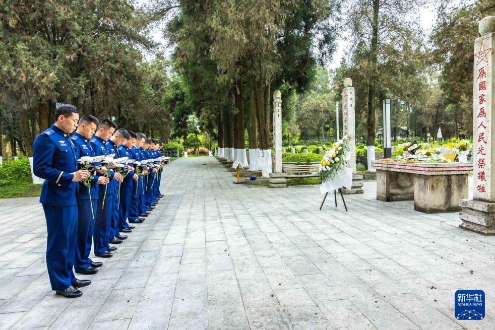 4月5日,贵州省安顺经济技术开发区消防救援大队消防员在安顺市烈士陵园缅怀先烈。新华社发(陈熙 摄)
