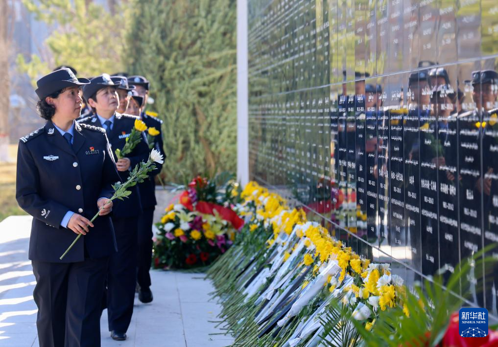 在乌鲁木齐市革命烈士陵园,民警在新疆公安英烈纪念碑前缅怀英烈(4月3日摄)。新华社发(邵世嵩 摄)