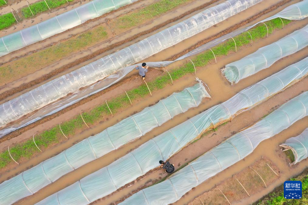 4月9日,在湖南省衡阳市衡阳县西渡镇梅花村,农民在管护秧苗(无人机照片)。新华社发(刘欣荣摄)