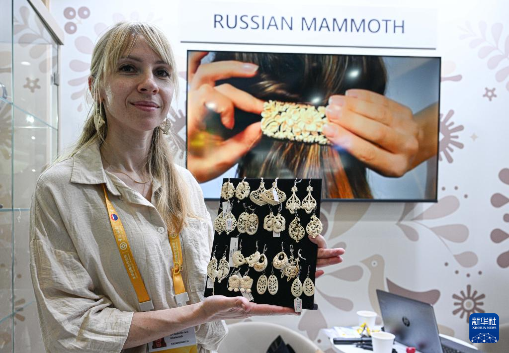 4月16日,参展商在第六届消博会现场展示俄罗斯工艺品。新华社记者 蒲晓旭 摄