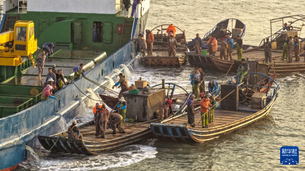 4月18日,在山东省荣成市爱伦湾,养殖工人将从福建“越冬”归来的鲍鱼转运到养殖海域(无人机照片)。新华社发(李信君 摄)
