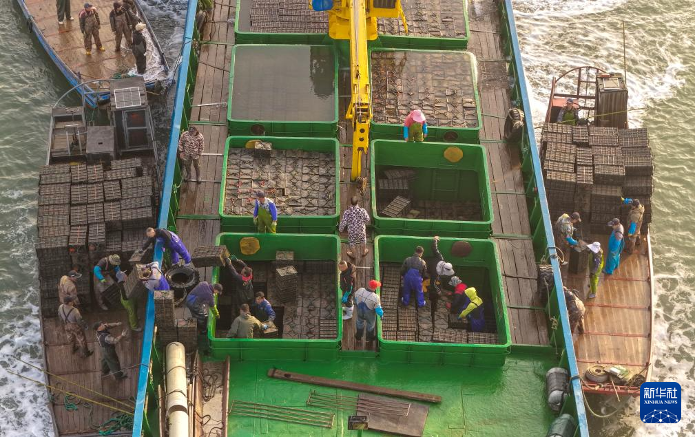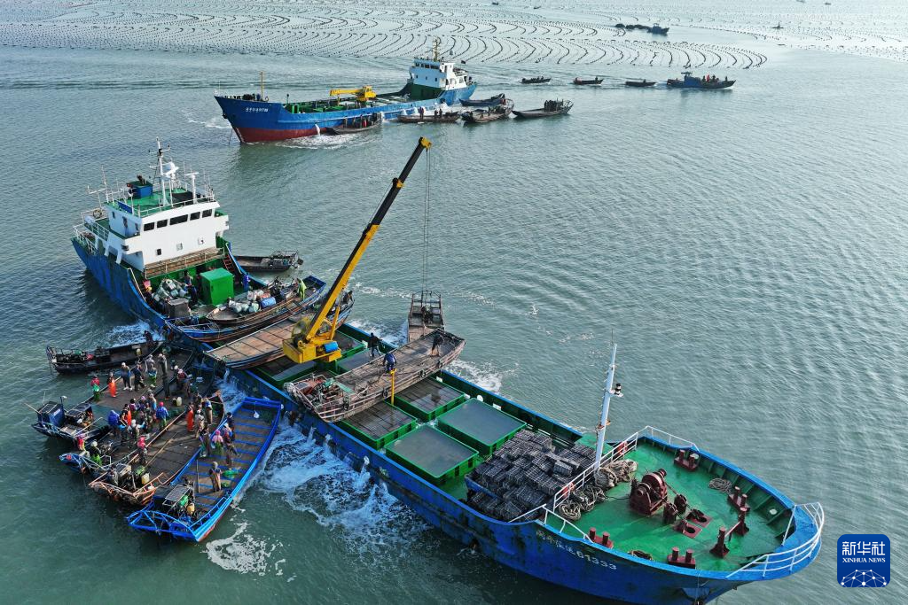 4月18日,在山东省荣成市爱伦湾,养殖工人将从福建海域“越冬”归来的鲍鱼转运到养殖海域(无人机照片)。新华社发(王福东 摄)