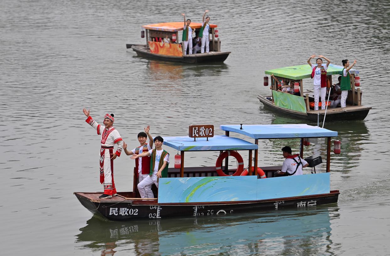 4月19日,2026年“广西三月三·八桂嘉年华”文化旅游品牌活动继续在南宁市民歌湖举行,演员乘坐游船在湖上表演。新华社记者 陆波岸 摄