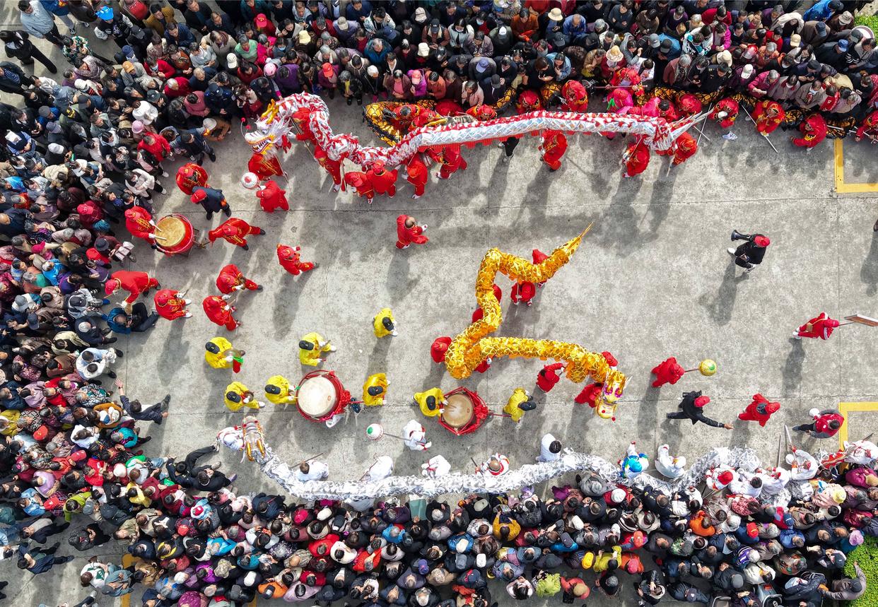 4月19日,村民在江苏省泰州市海陵区唐甸村“三月三”传统庙会上进行舞龙表演(无人机照片)。新华社发(汤德宏 摄)
