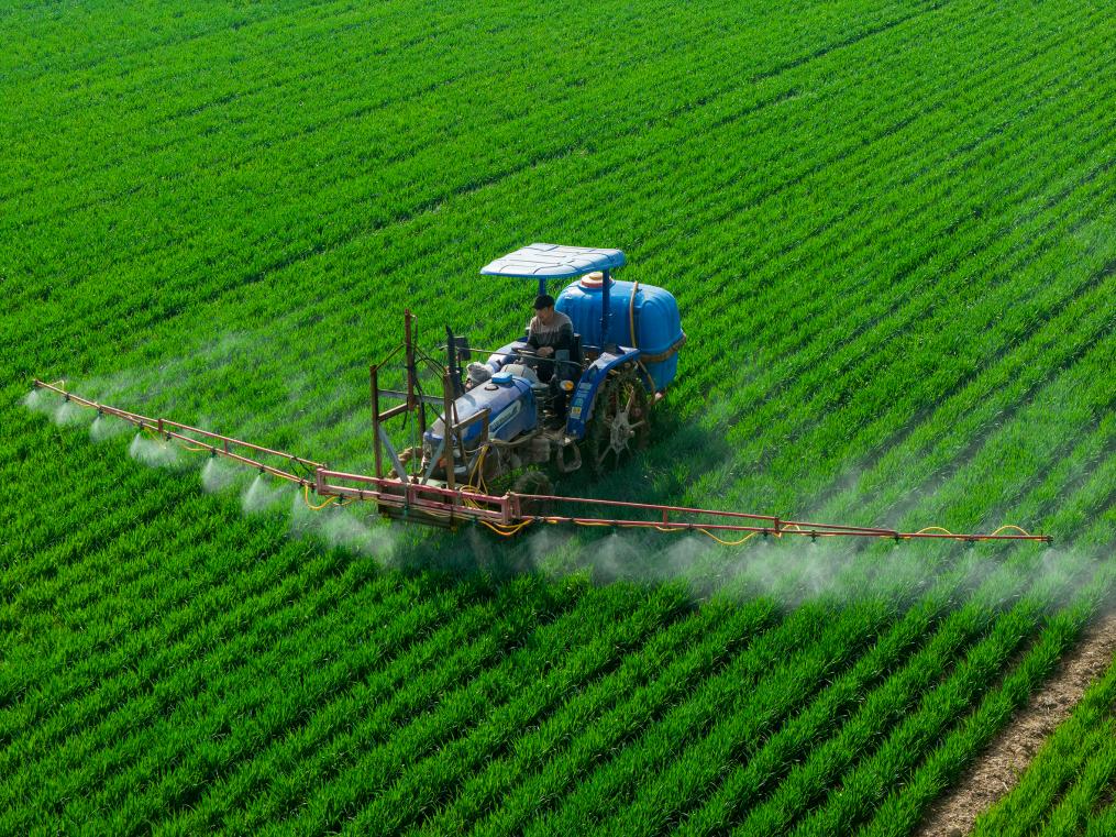 2026年3月20日,在河南省商丘市夏邑县曹集街道刘枣园村,村民在麦田内开展“一喷三防”作业。新华社发(王高超摄)