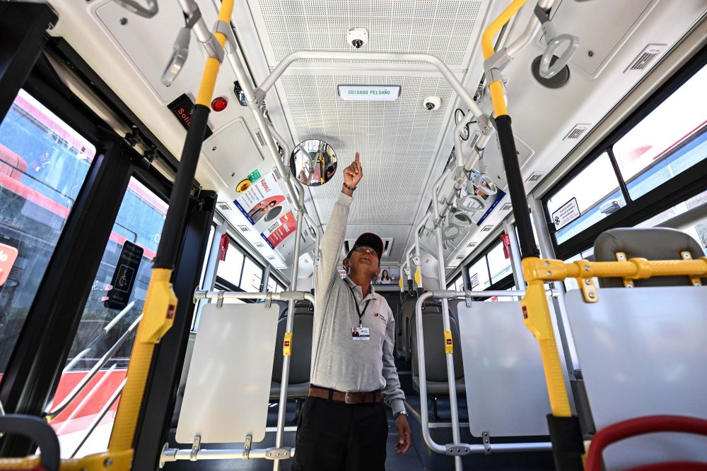 2025年10月16日,在智利北部阿塔卡马大区首府科皮亚波,一名司机介绍新启用的中国生产的新能源公交车。当日,科皮亚波启用121辆中国生产的新能源公交车,成为南美洲首个公交系统全面电动化的城市。