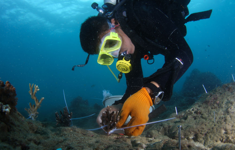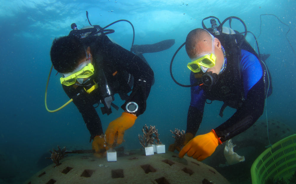 在海南省三亚市亚龙湾相关海域,潜水员在海底移植珊瑚(2022年11月17日摄)。新华社记者 杨冠宇 摄