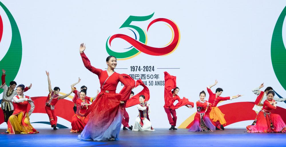 △当地时间2024年8月15日,在巴西首都巴西利亚,来自北京舞蹈学院民族舞团的演员在庆祝中巴建交50周年招待会上表演。