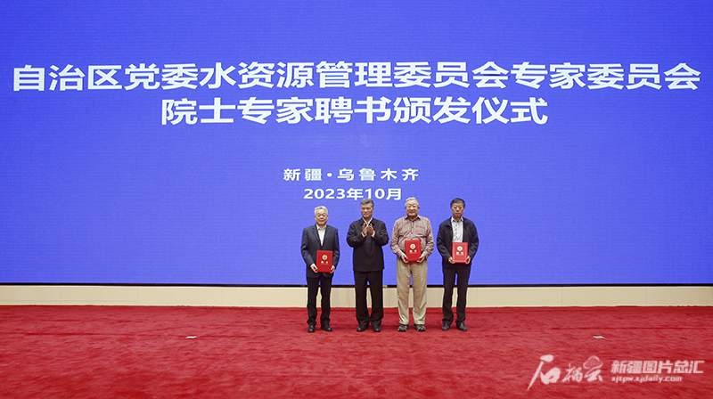会后,马兴瑞、艾尔肯·吐尼亚孜为中国工程院院士王浩、邓铭江等15位自治区党委水资源管理委员会专家委员会院士专家颁发了聘书。