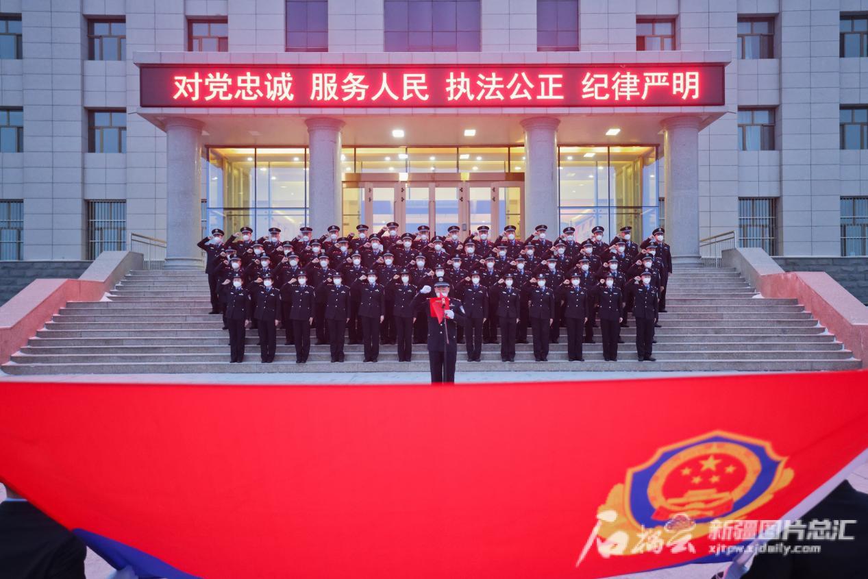 1月9日,塔克什肯口岸恢复客运通关和货运直通,当日上午开关之前,在巍峨的国门下,塔克什肯出入境边防检查站执勤民警整齐列队高举右拳,重温入警誓词。警旗猎猎当空展、誓言铮铮穿云霄,一字一句叩问入警初心,铸牢忠诚警魂。