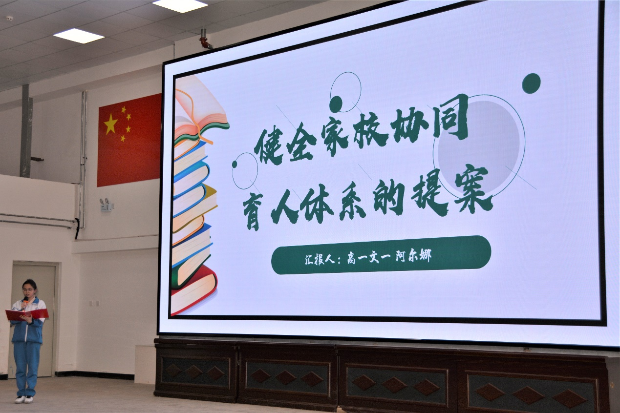 高一文1班学生阿尔娜·瓦里在《关于健全“家校社”协同育人体系的提案》中提到构建“家校社”协同育人体系,建议学校通过开设“家长讲师团”、建立“家长学校”、设立家长开放日、搭建家校沟通平台等方式,推动“家校社”全面协同育人体系取得新的育人成效。