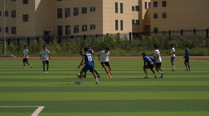为提前适应比赛,赛出好成绩,阿勒泰地区参赛运动员自7月2日起,已陆续进入训练场地进行常态化训练。在阿勒泰职业技术学院运动场,足球队的运动员们正在进行模拟球赛。