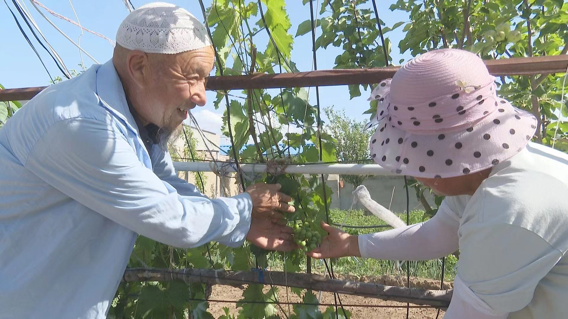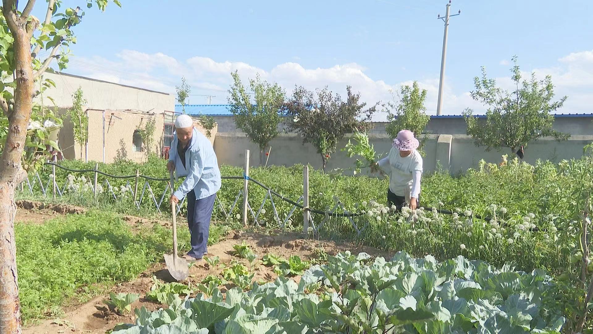 吉木乃县乌拉斯特镇克孜勒加尔村村民叶建龙说:“我和老婆两个人已经七十多了,没有能力干其他的活。所以自己种点菜,把自己生活要搞起来,国家的政策也好。现在庭院里有苹果树、海棠树、桃子树、杏子树等各种各样的果树,也种了二十多种蔬菜,有十五种花卉。吃不完的瓜果蔬菜我们就拿到市场去卖,销售得很快。”