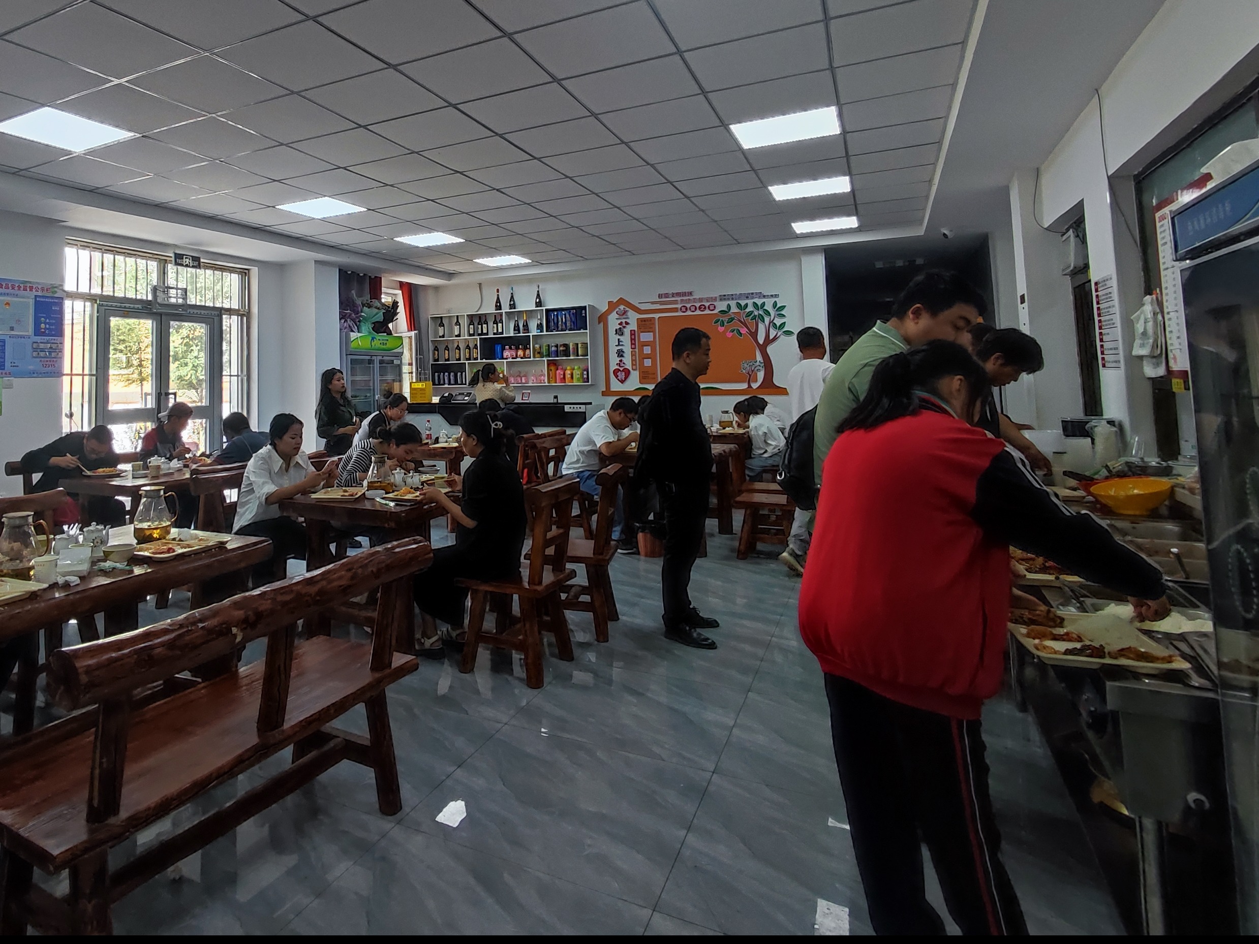 辣子鸡、西红柿炒鸡蛋、土豆丝、醋熘葫芦瓜、红烧牛肉、鱼香肉丝……荤素搭配,品种多样,干净整齐,价格实惠,想吃什么自主选择。富蕴县库额尔齐斯镇新蕴社区的幸福食堂内,不时地散发出阵阵饭香,三三两两的居民来到食堂,坐在一起唠唠家常,吃着可口的饭菜,这种画面幸福且温馨。