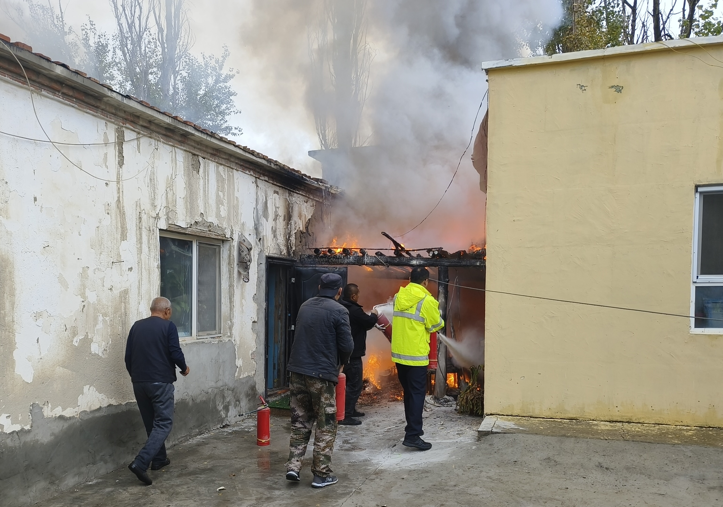 民警到达现场后,发现一彩钢棚房起火火势凶猛,浓烟滚滚起火房屋旁边就是居民房,一旦火势蔓延后果不堪设想。民警立即将水管连接到水泵上,警民合力用高压水枪、灭火器对房屋进行扑救,火势很快得到控制并被成功扑灭,除彩钢棚房烧毁外,并无造成其他损失。民警还对房主家进行全面细致的安全检查,确保无其他安全隐患存在,并反复叮嘱房主要及时更换维修老化电路电器,避免意外发生。