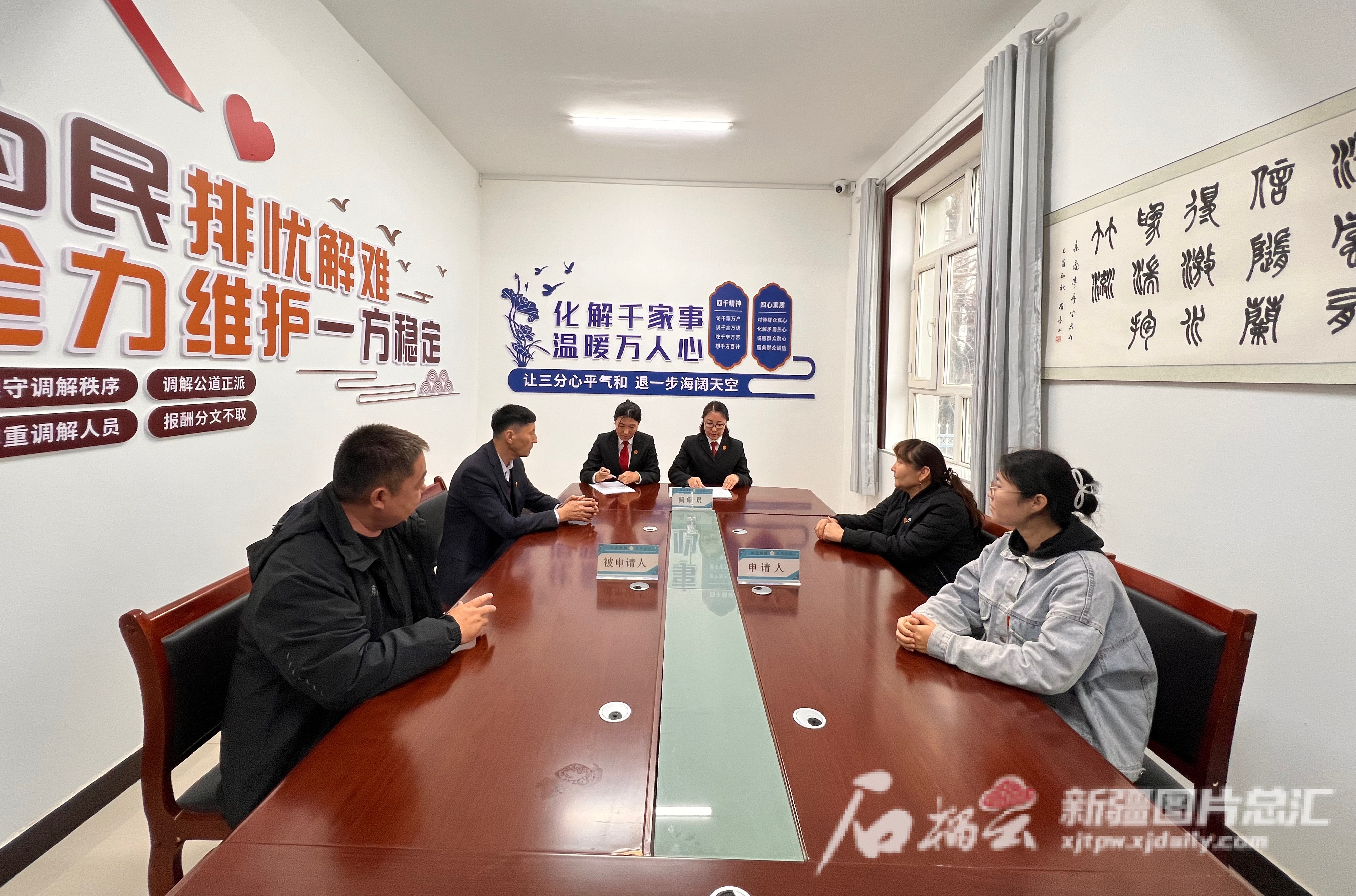 11月4日,在富蕴县恰库尔图镇人大代表联络站“共享法庭”,人大代表和法官在调解矛盾。石榴云/新疆日报记者 米日古力·吾摄