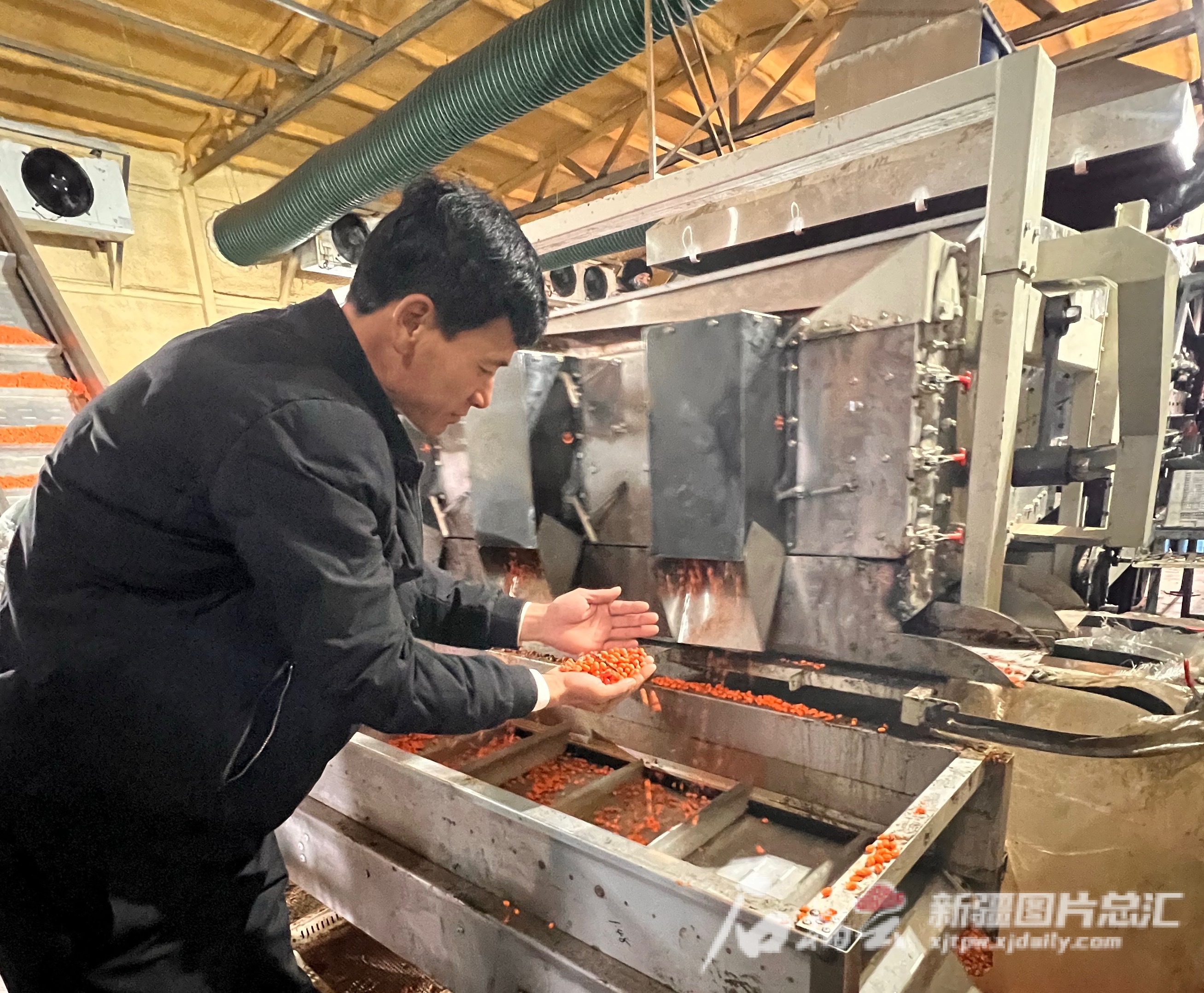 11月3日,自治区人大代表、布尔津县窝依莫克镇阔普巴拉村村民顾耀光在车间检查沙棘果品相。石榴云/新疆日报记者 米日古力·吾摄