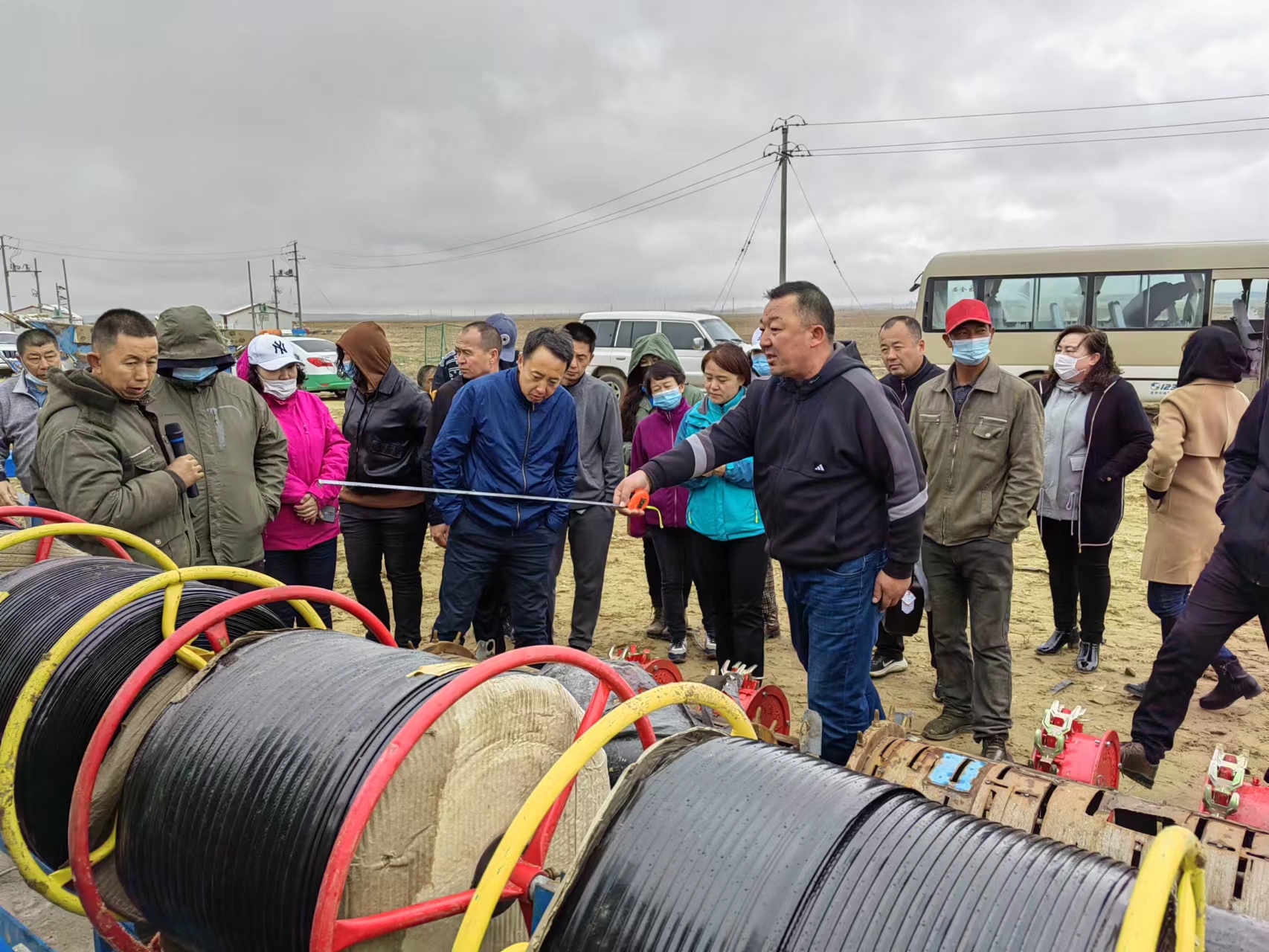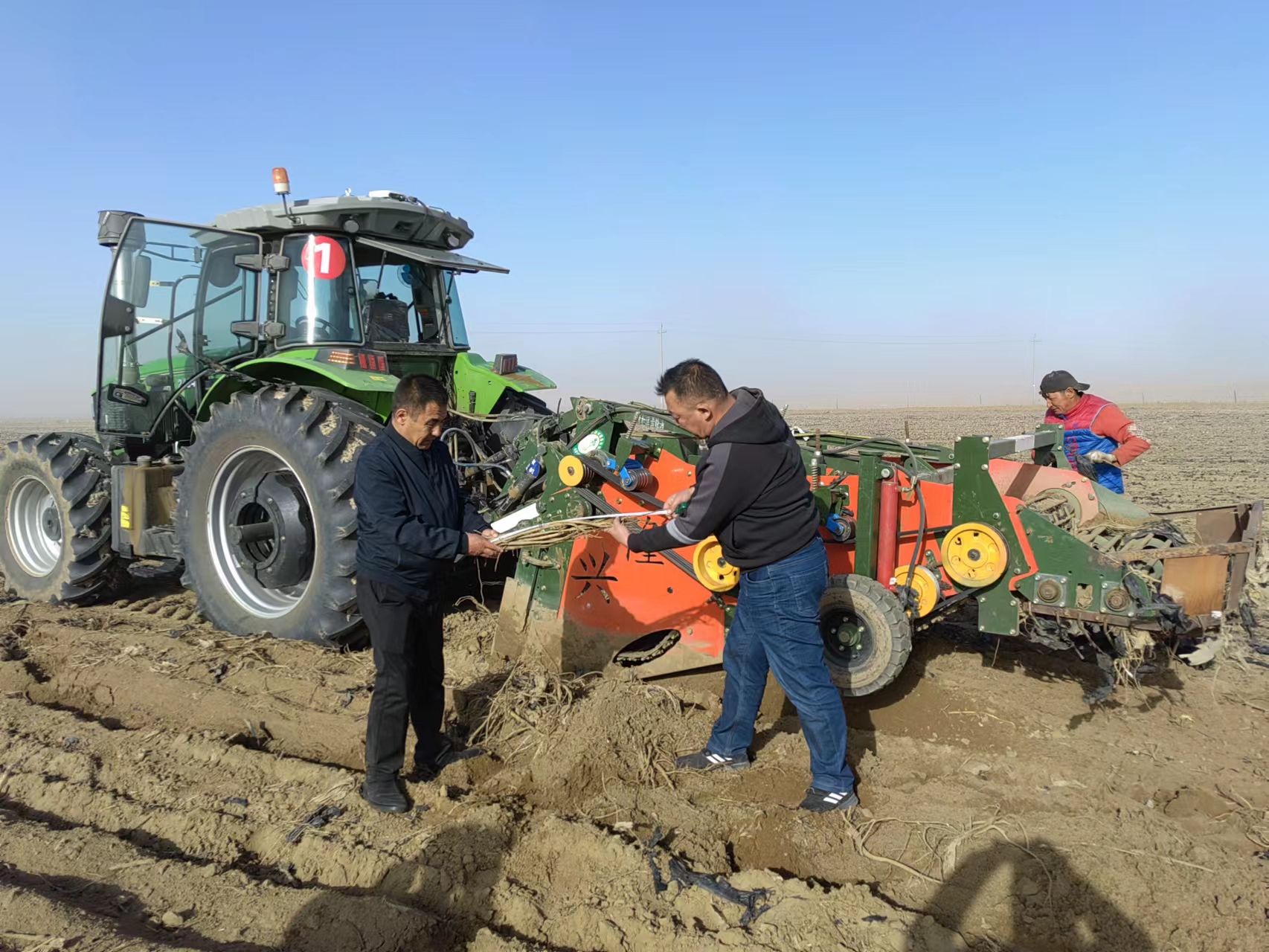 吾米提别克·阿里木汗(右一)在田间地头为农户进行农具现场操作。
