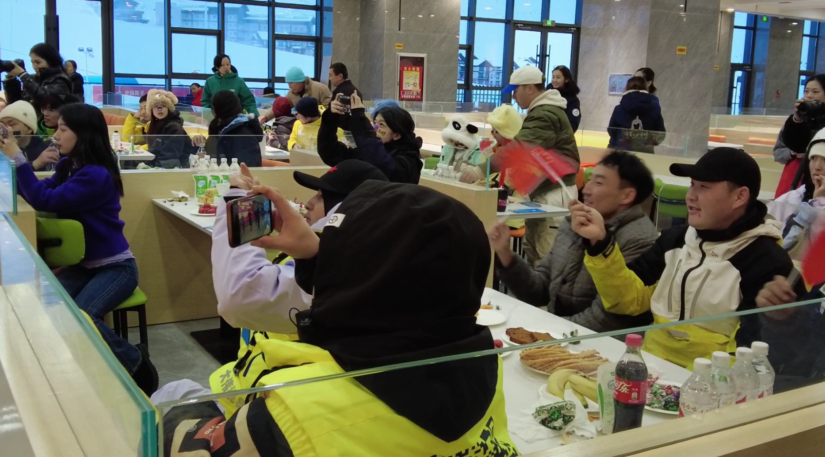 当日下午,将军山国际滑雪度假区雪具大厅A区热闹非凡,社区干部与雪友们共同观看了由地区歌舞团带来的《黑走马》等舞蹈节目。随着一盘盘热气腾腾的饺子摆上桌,大家围坐在一起,吃着饺子、看着节目,现场一派欢声笑语。