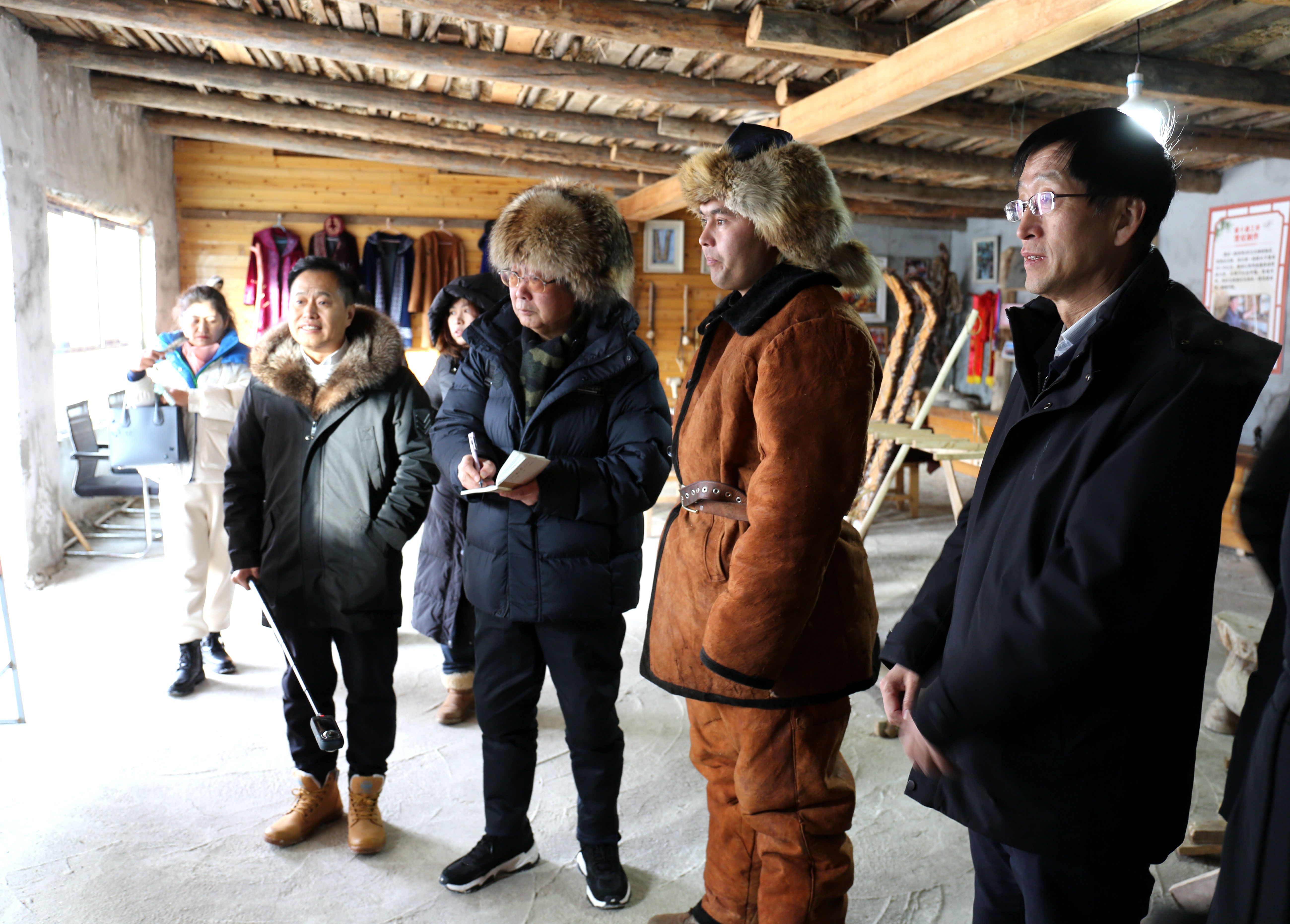 吉林省文联“文化润疆”文艺名家采风培训团在阿勒泰市拉斯特乡古老马皮滑雪板制作技艺基地采风。贺凌峰 摄