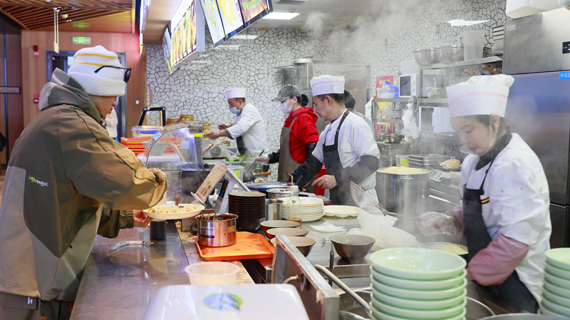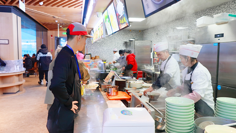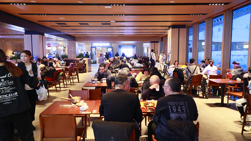 据了解,餐饮广场是滑雪者的集散地,也是作为滑雪场的主要活动区域。餐饮广场就餐区面积684㎡,共有160个餐位,11个餐饮窗口,主要以特色品牌餐饮为主、休闲小吃为辅,冬季日接待游客上千人次。