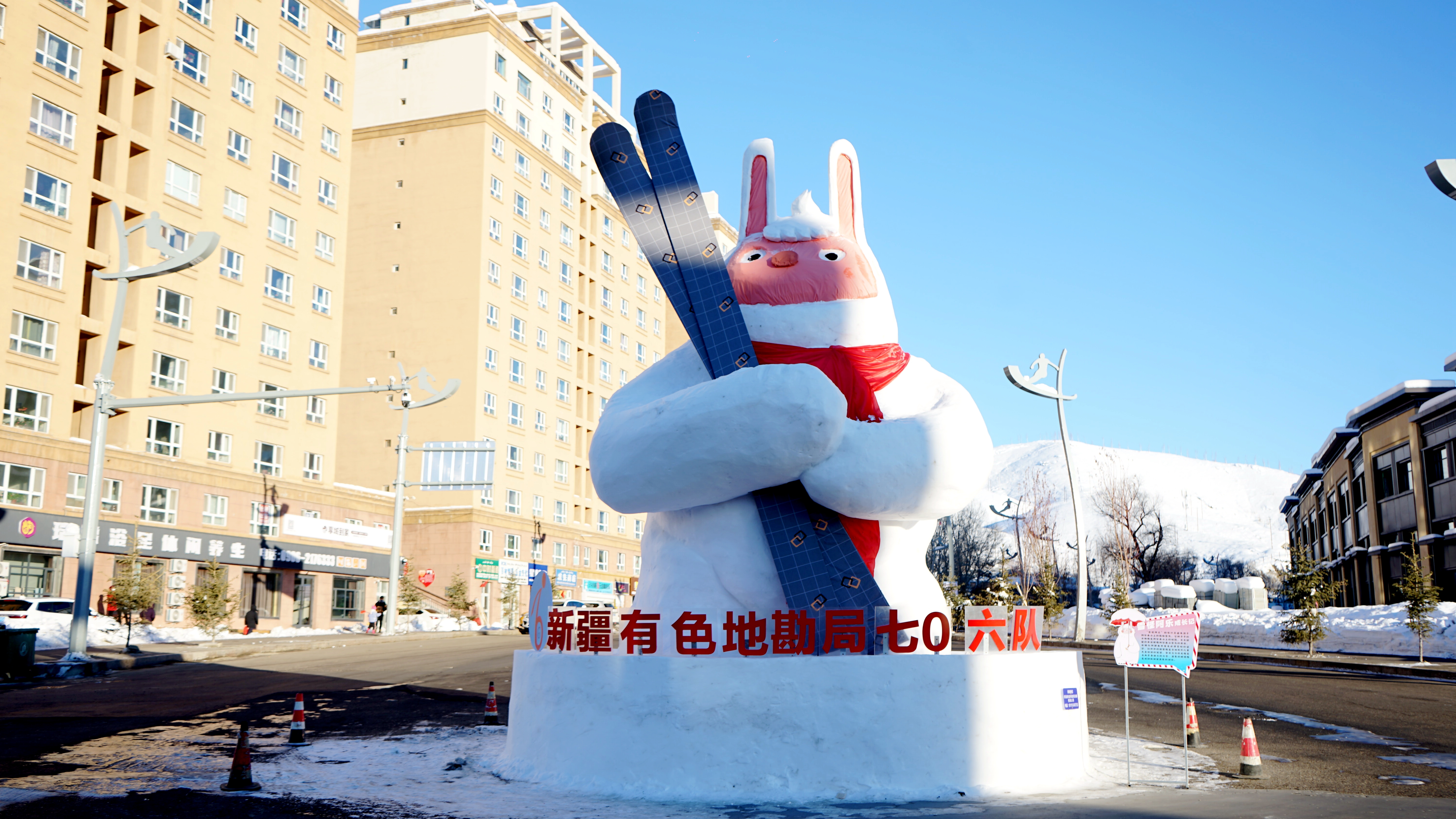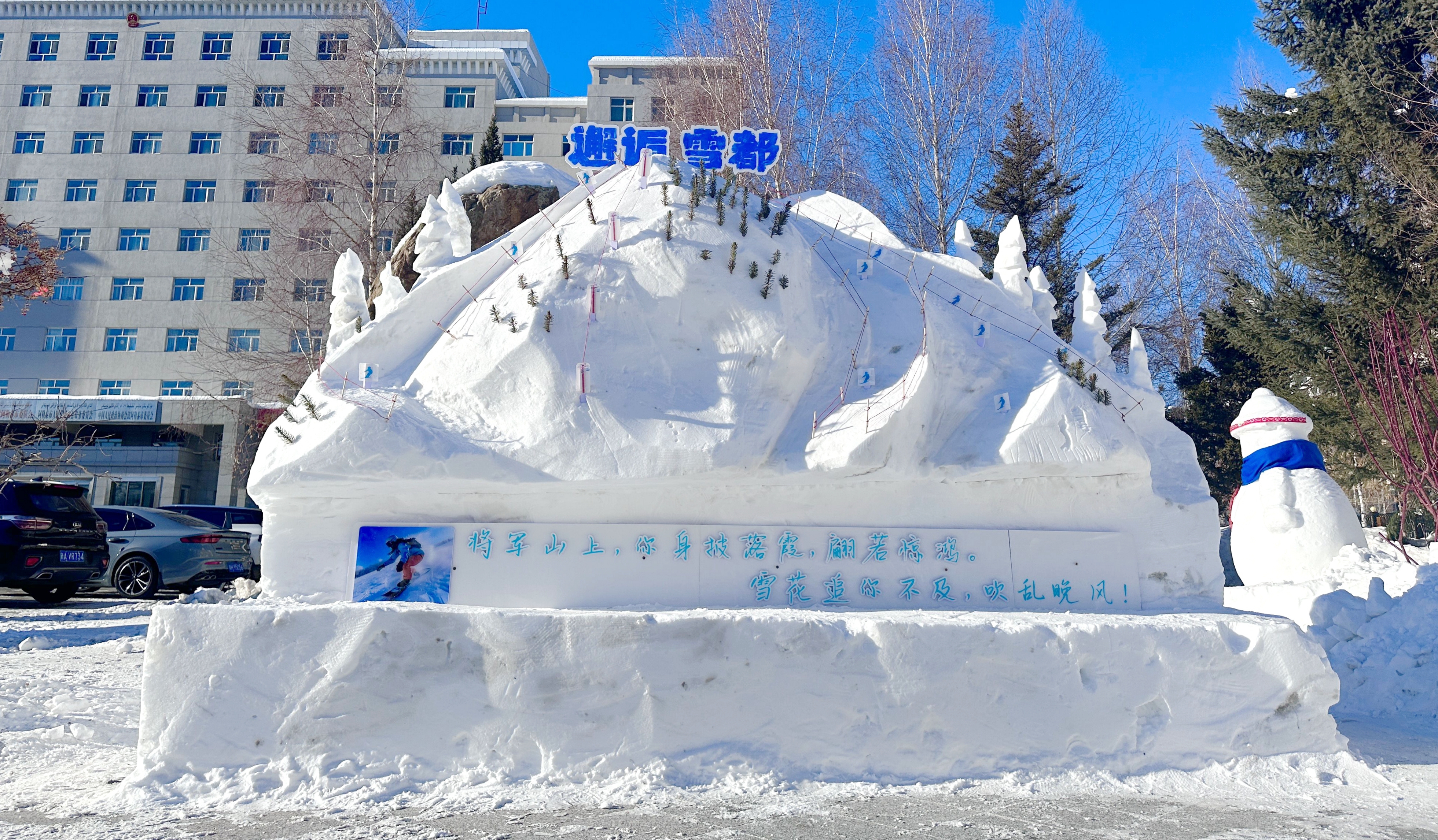 1月22日,一座将军山滑雪场的精致版雪雕坐落于阿勒泰市人民政府院内一角。狄文琦 摄