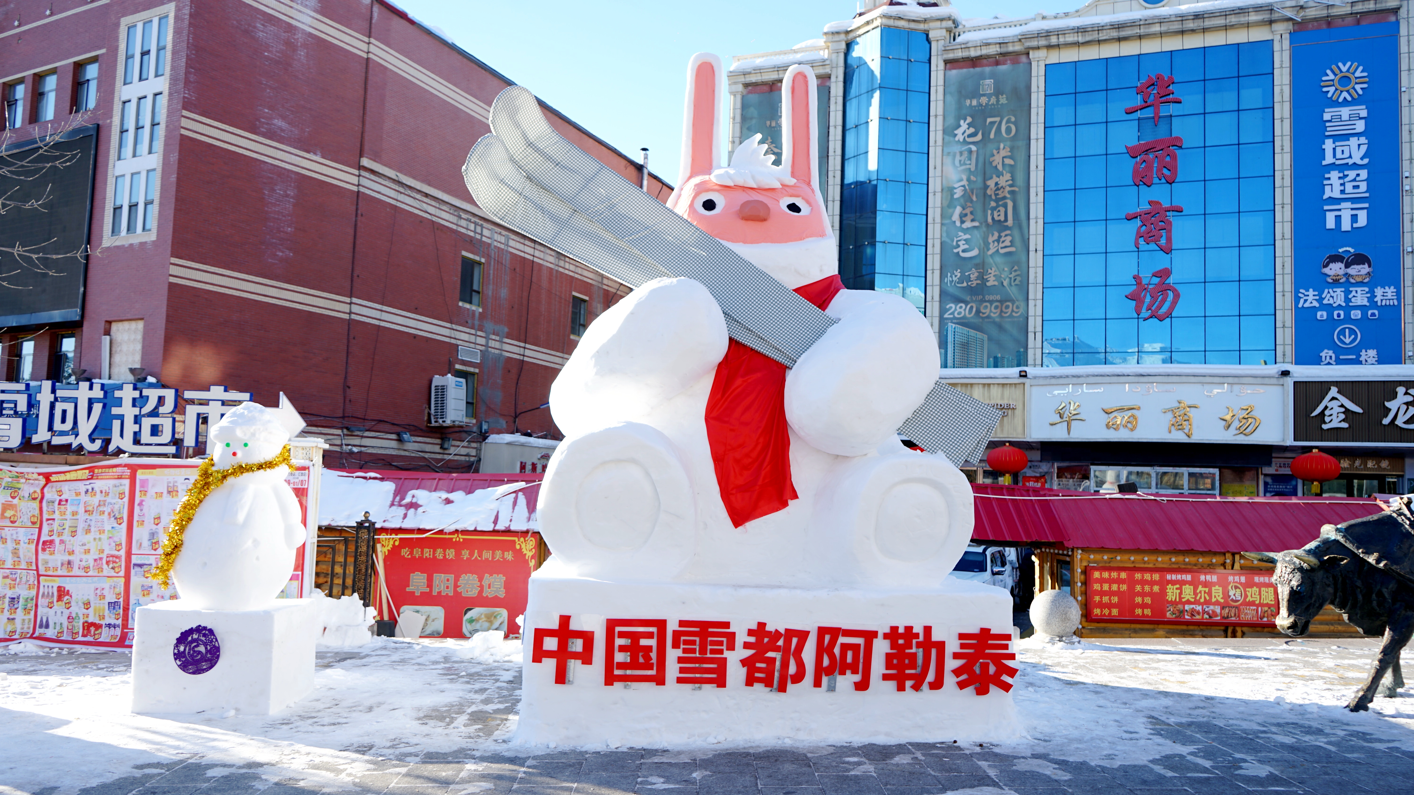 1月22日,在阿勒泰市银水广场,一群雪孩子一字排开,认真地看着来往的车辆和行人,招呼大家来广场玩耍。狄文琦 摄