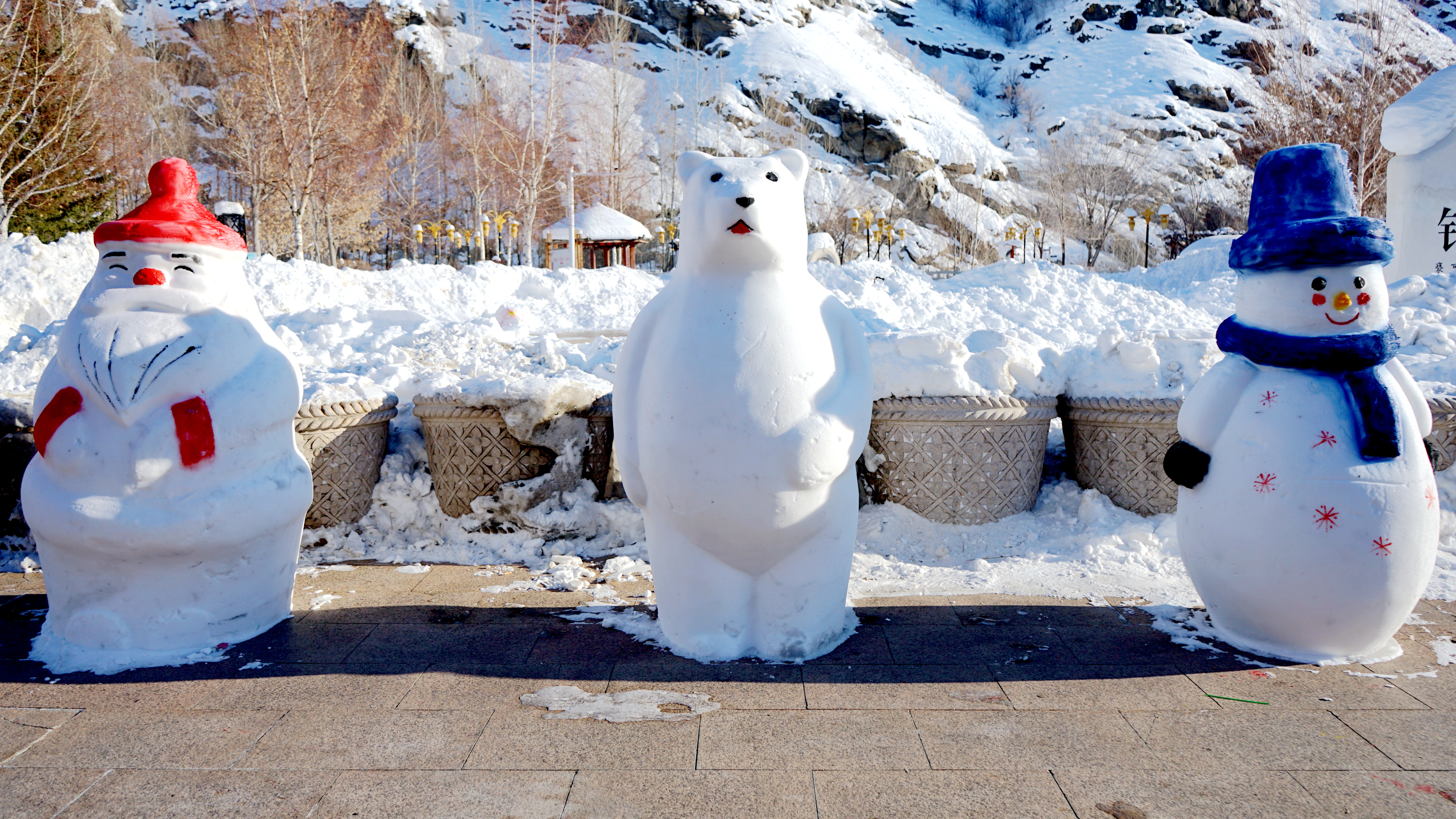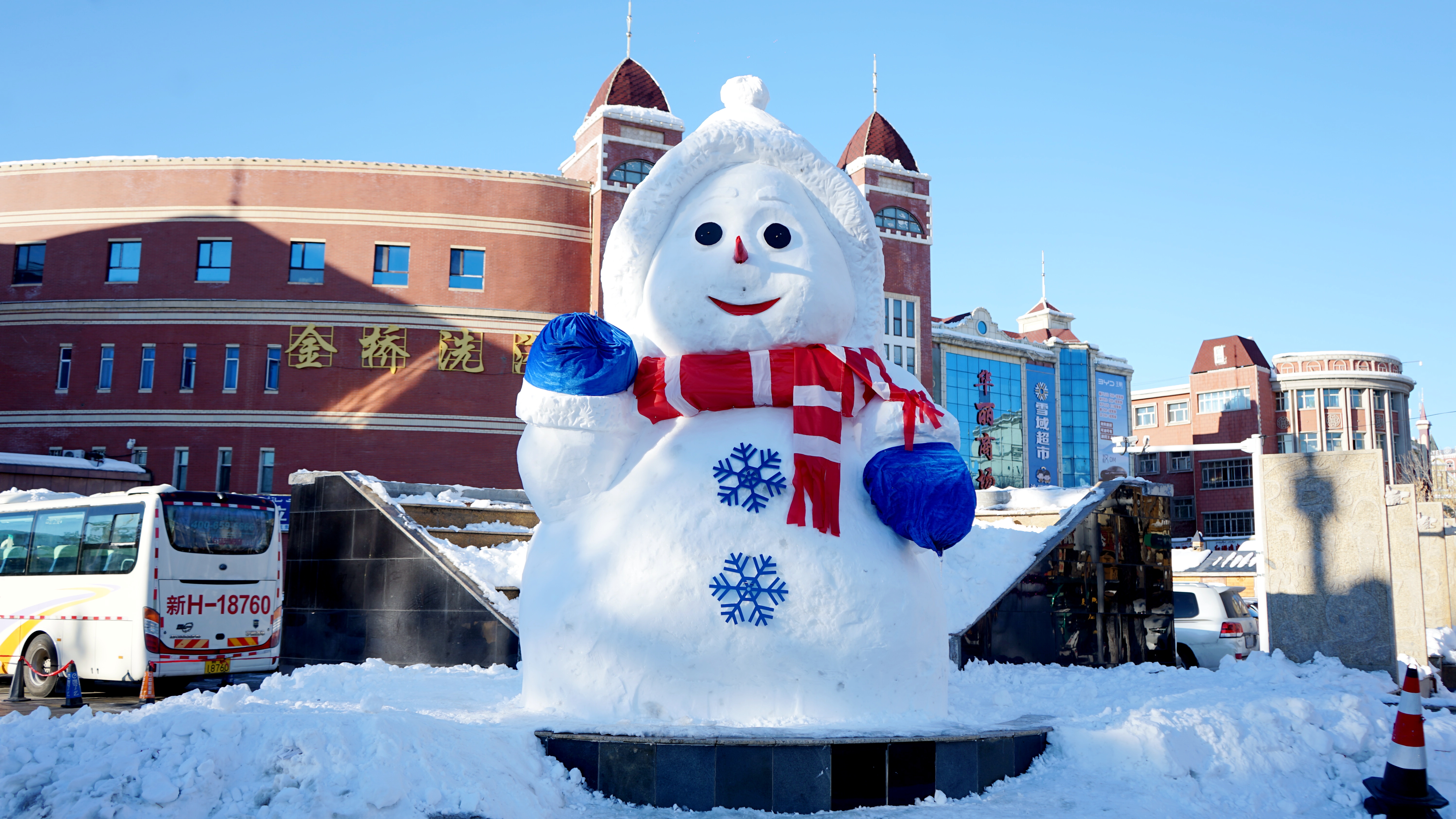 1月22日,在阿勒泰市金桥酒店门前,一个围着红围巾,戴着蓝色手套的雪孩子吸引了大家的注意。狄文琦 摄