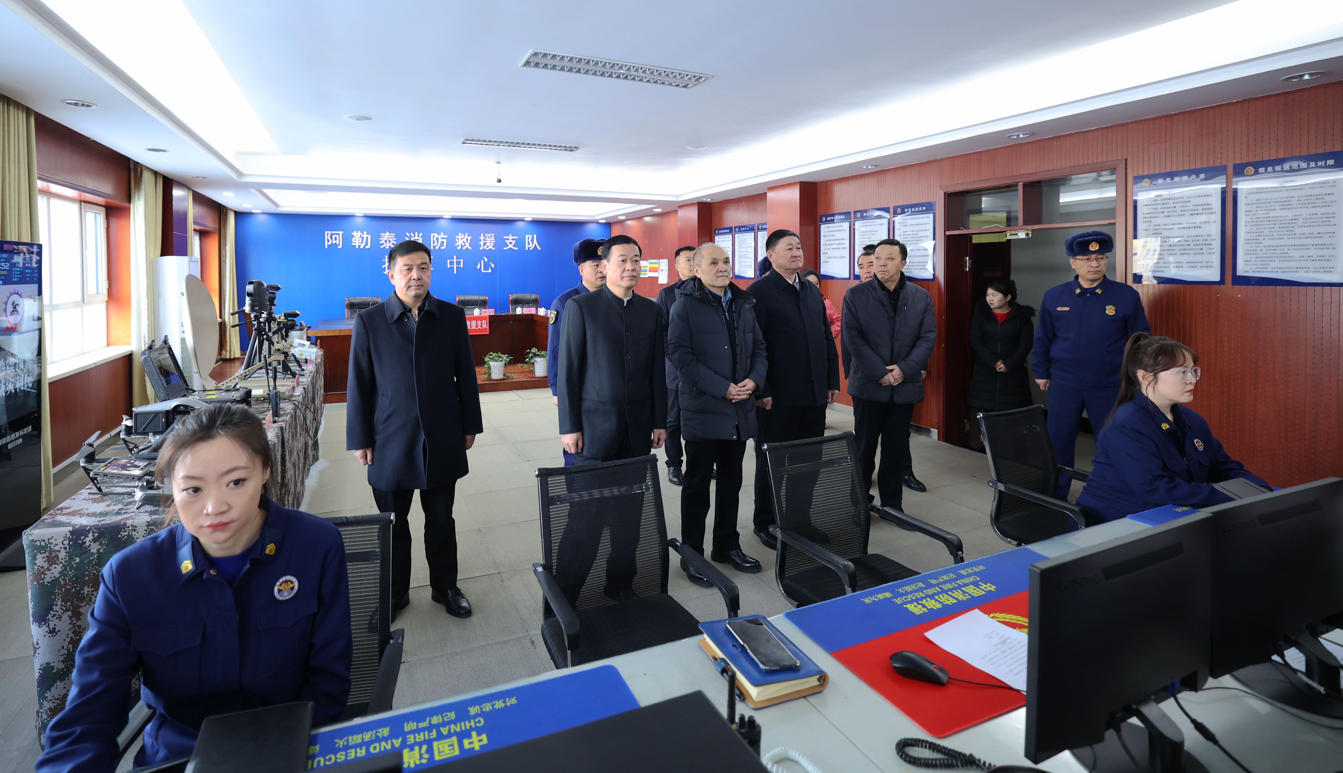 在阿勒泰消防救援支队,谢少迪一行走进指挥中心,视频连线地区各级消防救援队伍,查看节日期间消防救援队伍执勤备战情况。