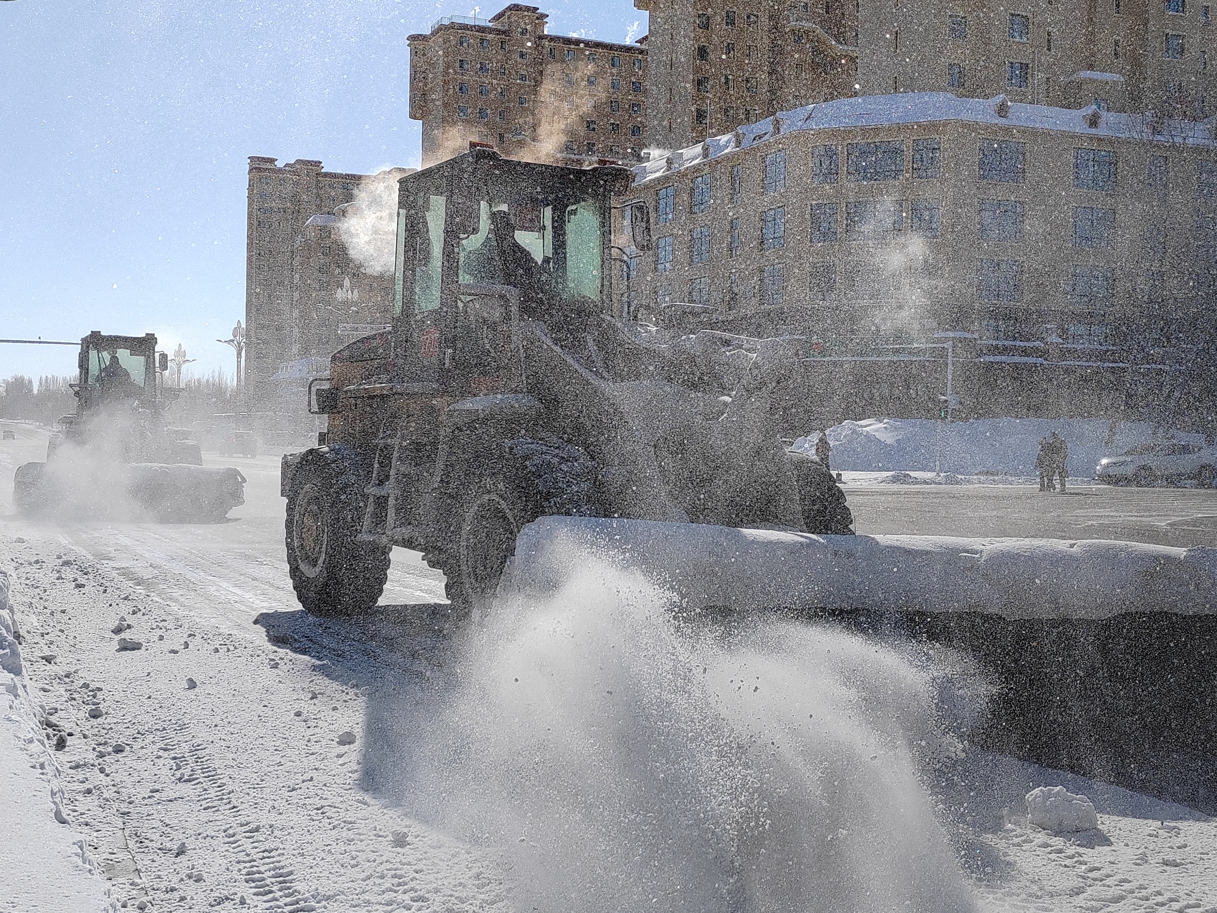 2月19日,雨水节气里的阿勒泰市区。扫雪车正在清理积雪。记者 代维利 摄