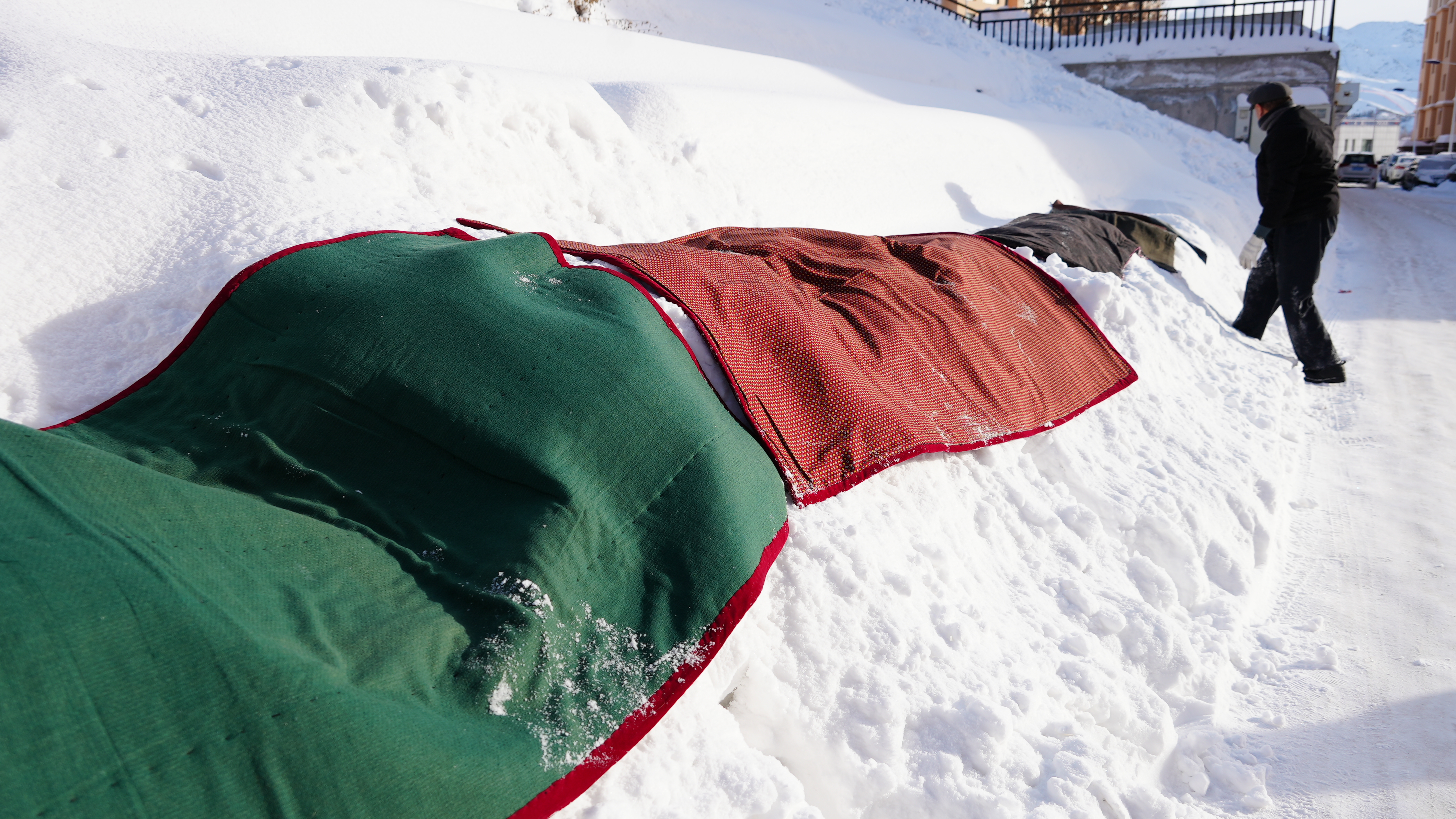 2月19日,雨水节气里的阿勒泰市区。恰秀南苑小区的市民正在晒毯子。记者 代维利 摄