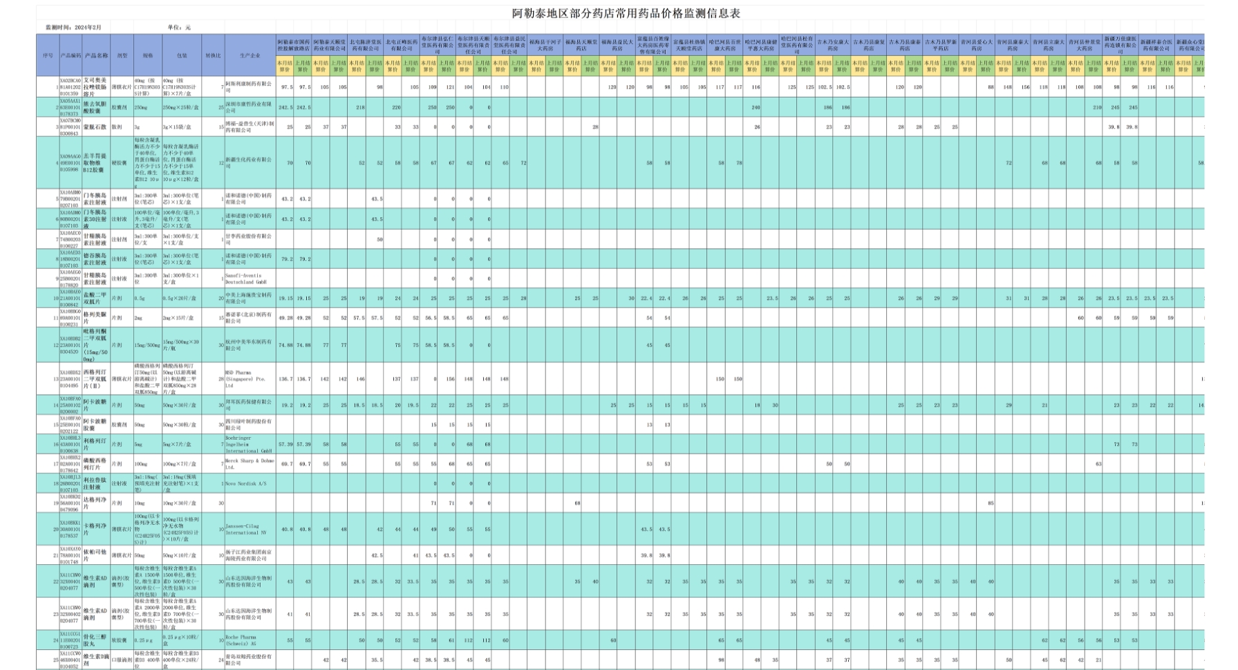 记者从公示单上看到,公示内容包括药品产品编码、名称、价格、剂型、规格、包装、生产企业等,居民买药时不用满城跑腿找药店进行询价,只要时常关注地区医疗保障局公布的《阿勒泰地区26家定点药店110种常用药品零售价格监测情况公示》,就能实现“货比多家”。