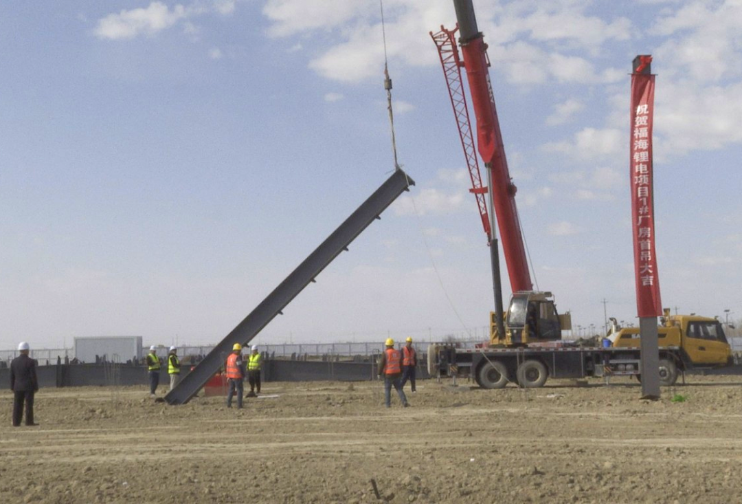 在福海县,高登赛6GWH锂电PACK产业基地建设项目地面工程全面开工,预计6月完成全部基建工程。施工现场,一台大型起吊机将长9米、重2吨的立柱稳稳吊起,随着起重臂的缓缓移动,立柱被放入指定区域,安装师傅们迅速行动,开始校准、固定。