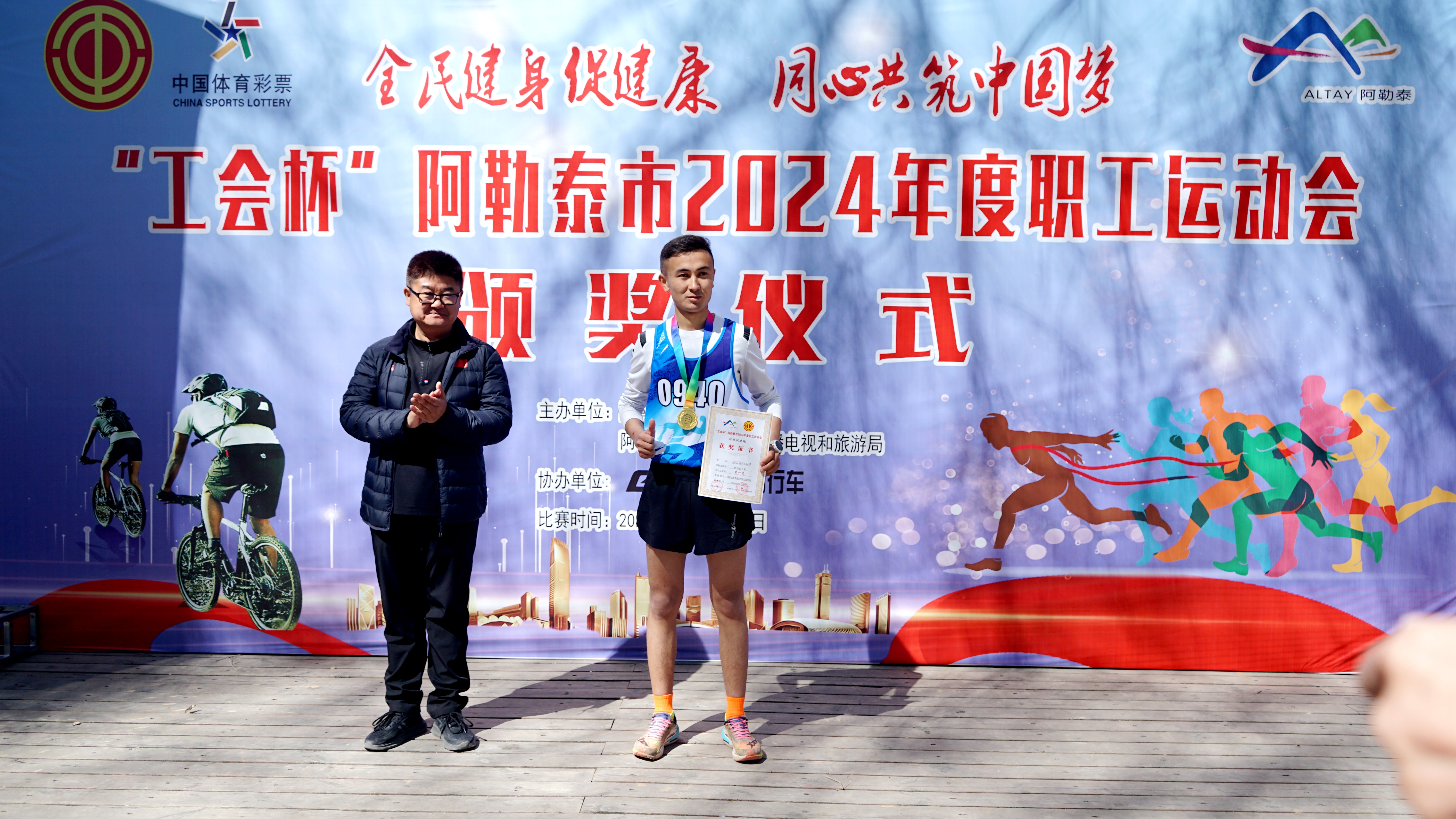 4月28日,在“工会杯”阿勒泰市2024年度职工运动会环城健康跑比赛结束后,男子组第一名上台领奖。