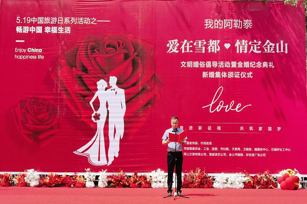 5月20日,阿勒泰市禁毒办联合阿勒泰市民政局以“爱在雪都·情定金山—金婚纪念典礼暨新婚集体颁证仪式”为契机,开展“520浪漫日,我们与禁毒宣传结缘”宣传活动。