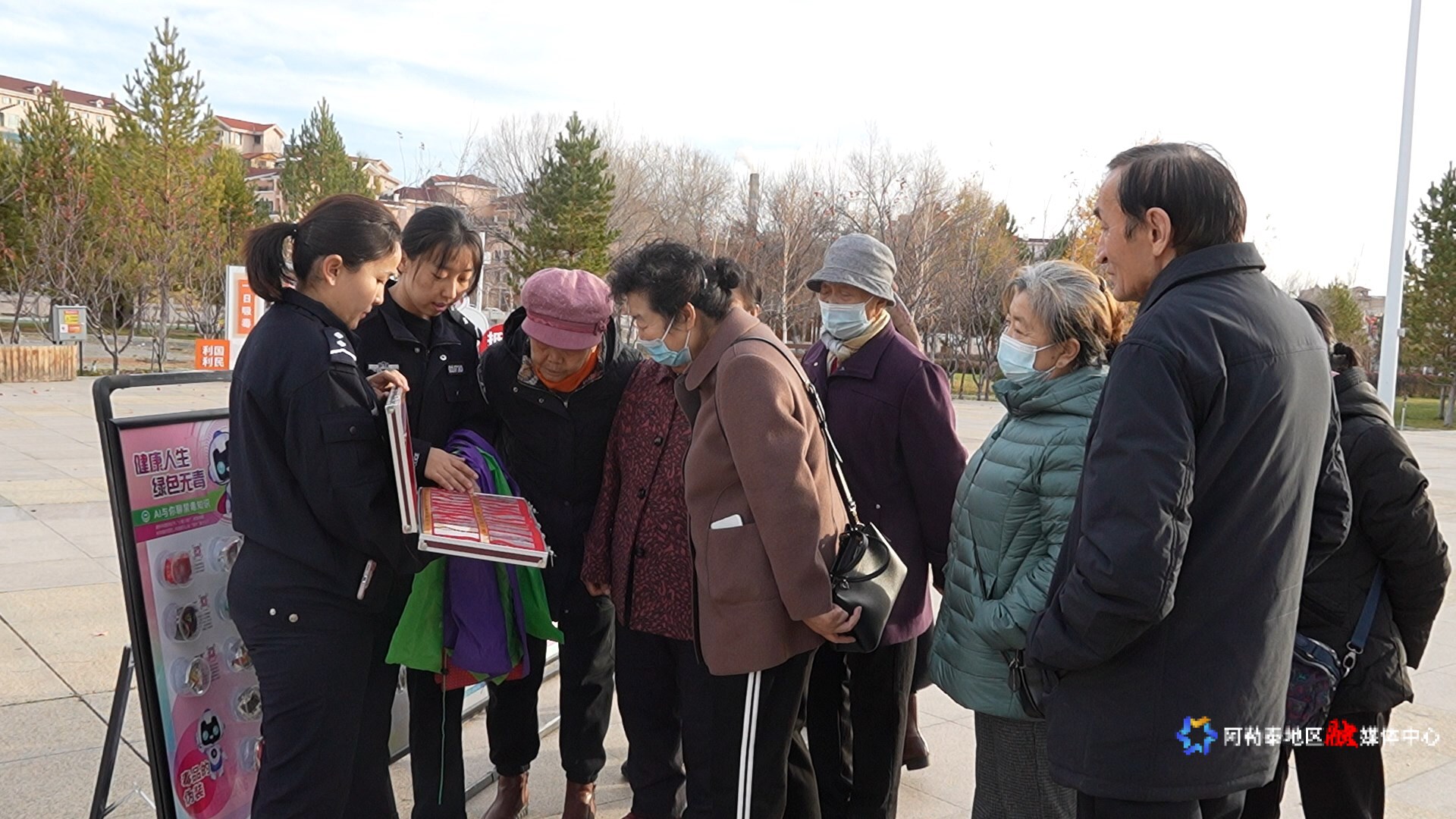 当天下午,在阿勒泰市禁毒主题公园,工作人员手持宣传册,耐心地向过往居民讲解毒品的危害。
